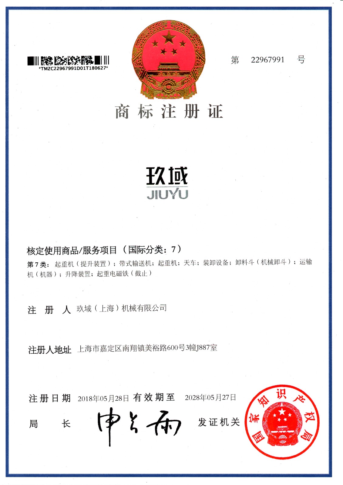玖域(上海)機械有限公司于2018年5月28日正式獲得國家知識產權局頒發的“玖域/JIUYU”商標注冊證。